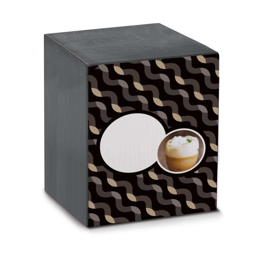 Copo em vidro borossilicato com parede dupla isolada a ar. Capacidade até 220 mL. Fornecido em caixa presente personalizável. Certificação EU Food Grade