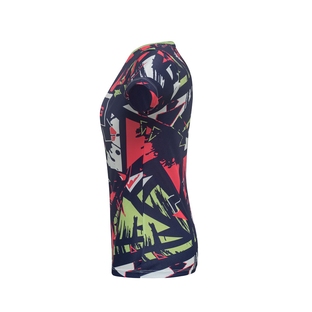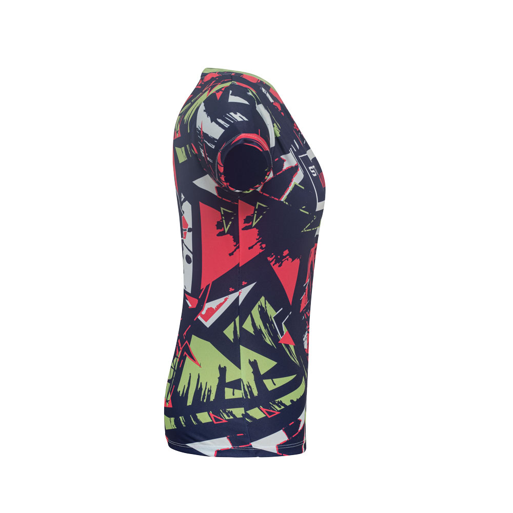 Camiseta feminina de corte cinturado em malha 100% polyester fiado (135 g/m2) com fio 30/1 polyester. Com gola em ribana 1×1 com fita de reforço e com costura dupla nas mangas, barra de fundo e laterais. Produto contém certificação ABVTEX. Fabricado no Brasil