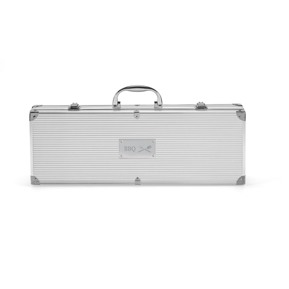 Kit churrasco em estojo de alumínio. Composto por 4 utensílios em aço inox: faca chefe, pinça, garfo e espátula. Certificação EU Food Grade. Estojo: 385 x 110 x 80 mm | Placa: 60 x 30 mm