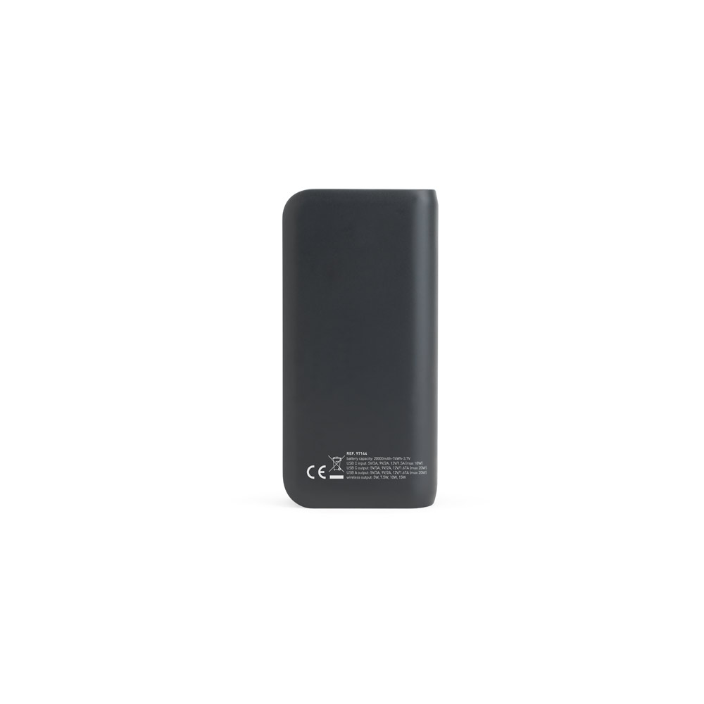 Bateria portátil com carregador por indução (wireless) em ABS 100% reciclado, com capacidade de 20.000 mAh e tela indicadora de nível de carga. A power bank tem uma porta de entrada/saída USB-C e uma porta de saída USB, ambas de carregamento rápido PD 20W. O carregador wireless tem uma potência máxima de 15W. Incluso um cabo de carregamento com saída dupla USB-A/USB-C. Compatível com dispositivos móveis com tecnologia de carregamento sem fios. Fornecida em caixa presente de papel kraft reciclado