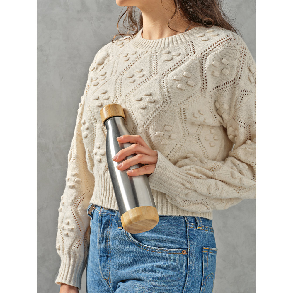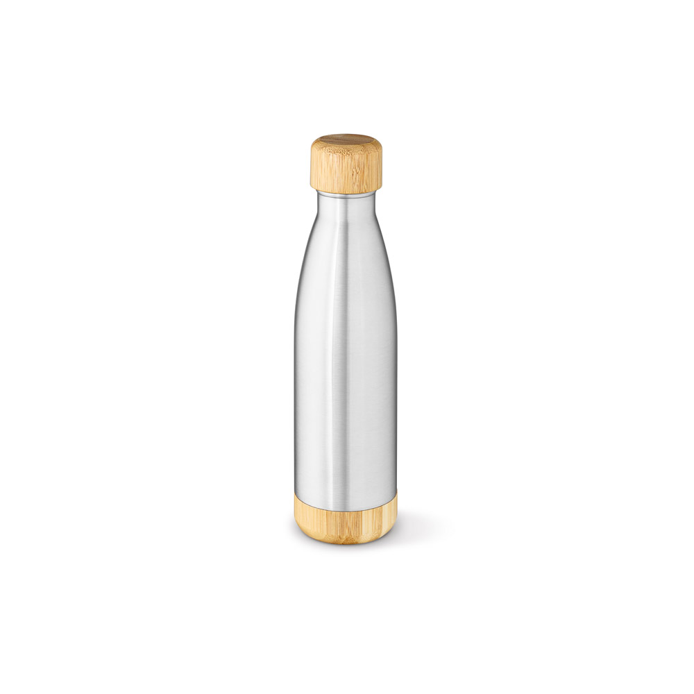 Garrafa em aço inox 90% reciclado de parede dupla térmica, isolada a vácuo. Possui tampa e base em bambu. Capacidade até 550 mL. Fornecido em caixa presente de papel kraft reciclado. Certificação EU Food Grade. A cor e o resultado da impressão nos materiais naturais pode variar entre produtos. ø71 x 272 mm