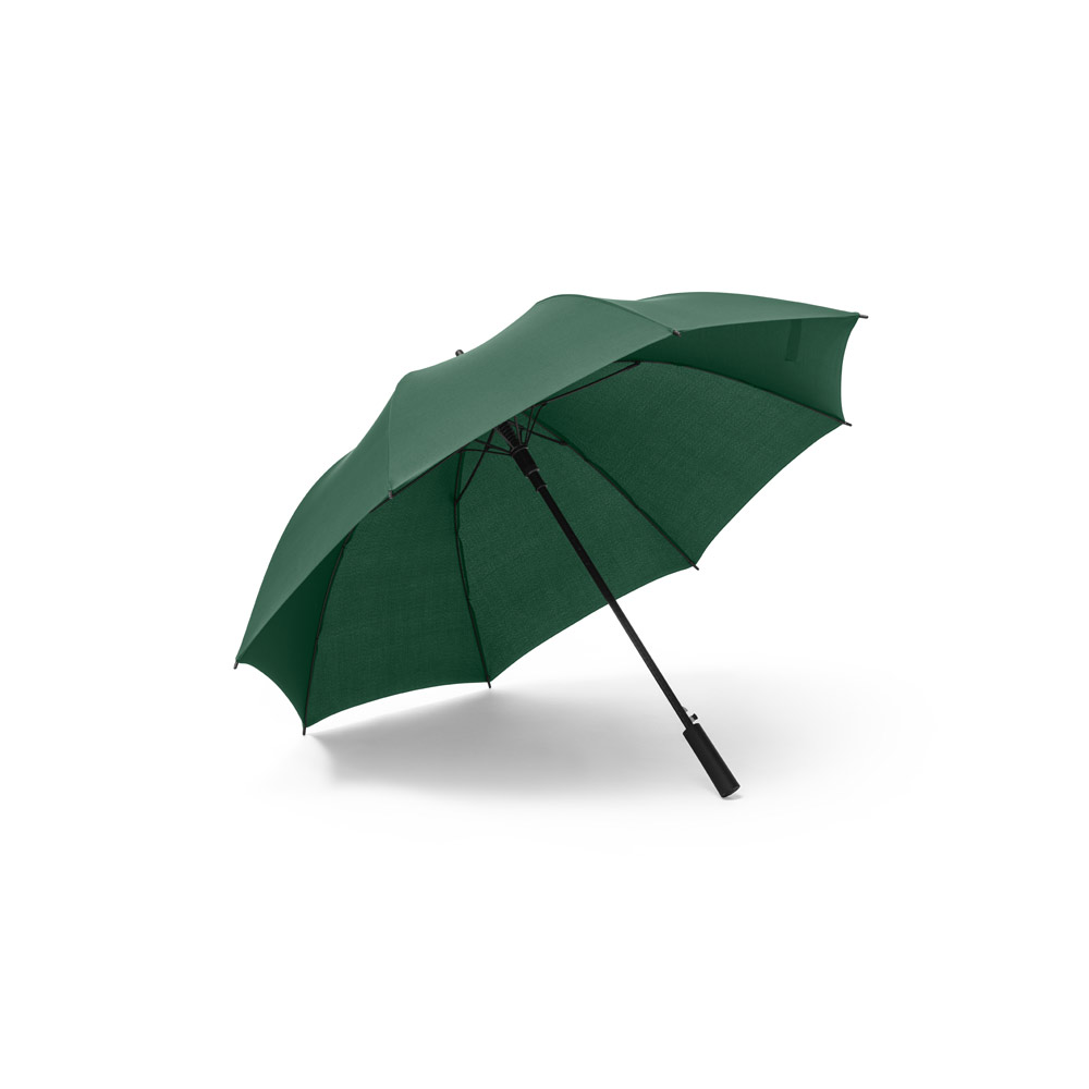 Guarda-chuva em poliéster pongee 190T, com haste e varetas em fibra de vidro e pega em PP. O guarda-chuva tem abertura automática e é à prova de vento. Fornecido em bolsa