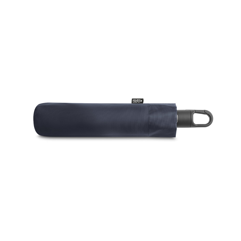 Guarda-chuva de 23” em poliéster 100% reciclado pongee 190T, com varetas em fibra de vidro, haste metálica e pega em ABS 35% reciclado. O guarda-chuva, dobrável em 3 seções, tem abertura e fecho automático e é à prova de vento. Fornecido em bolsa. ø1050 x 330 mm | Sacola: ø50 x 250 mm