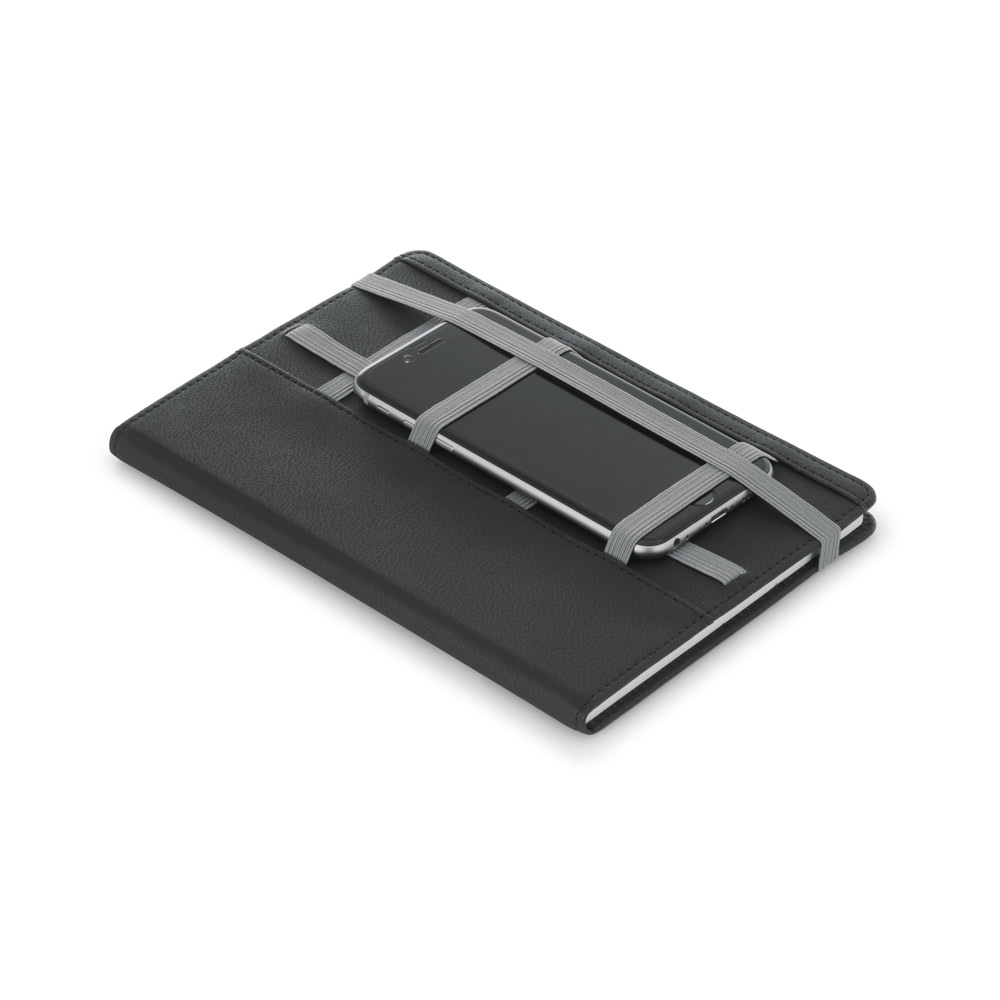 Caderno A5 de capa dura em c. sintético, com 160 páginas lisas. Contém elásticos com capacidade para suportar esferográfica (não inclusa), celular e cartões e um elástico para fechar o bloco de notas. Fornecido em bolsa de non-woven