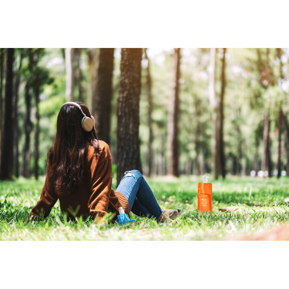 Squeeze dobrável em PE com bico de sistema “push-pull” e acabamento translúcido com mosquetão para fácil transporte. Capacidade até 460 mL. Certificação EU Food Grade