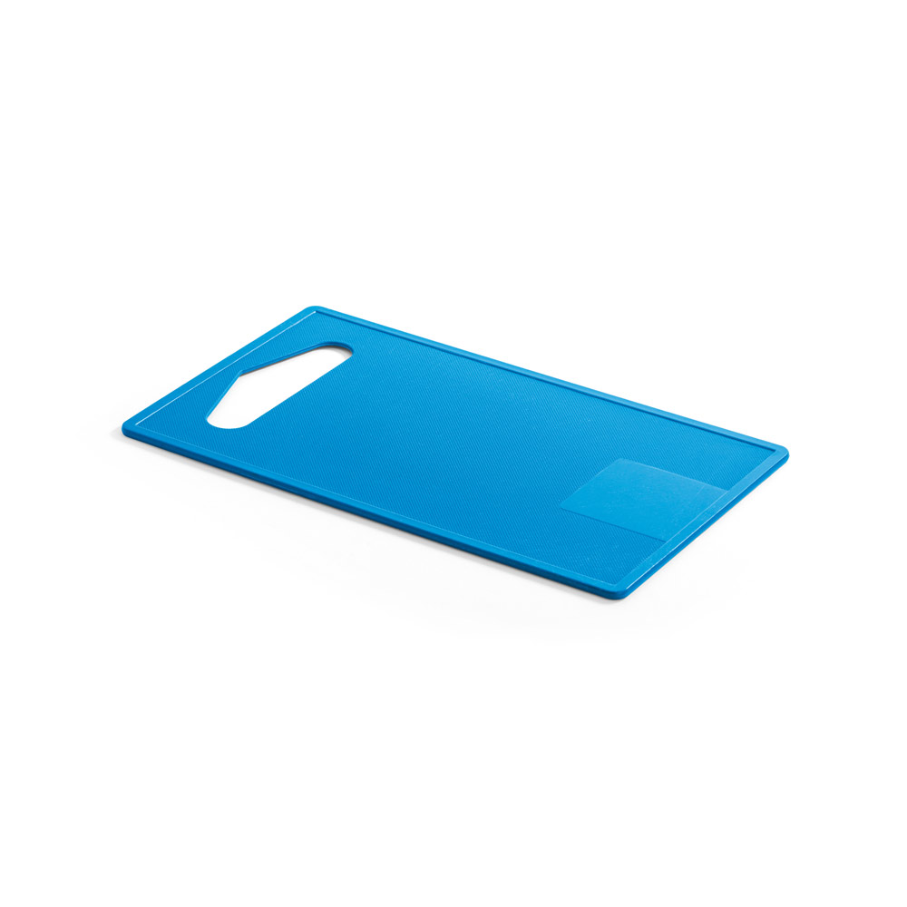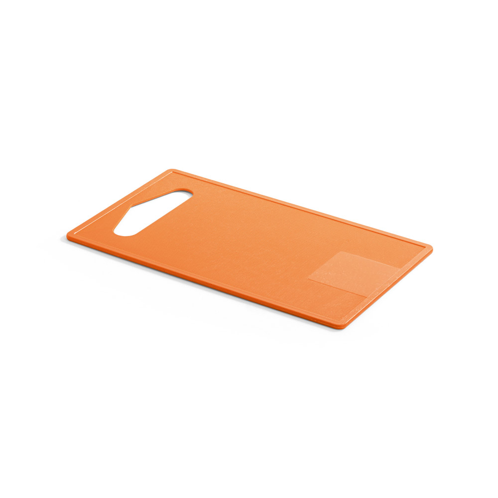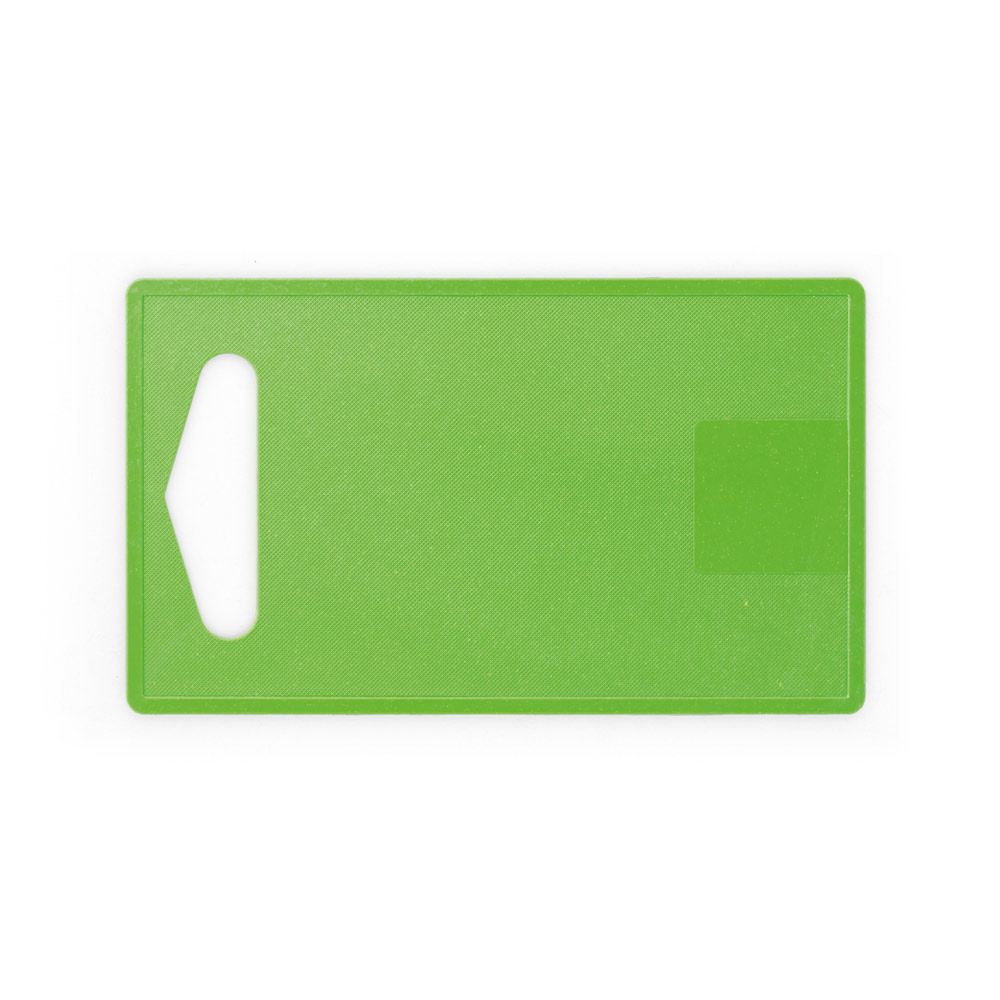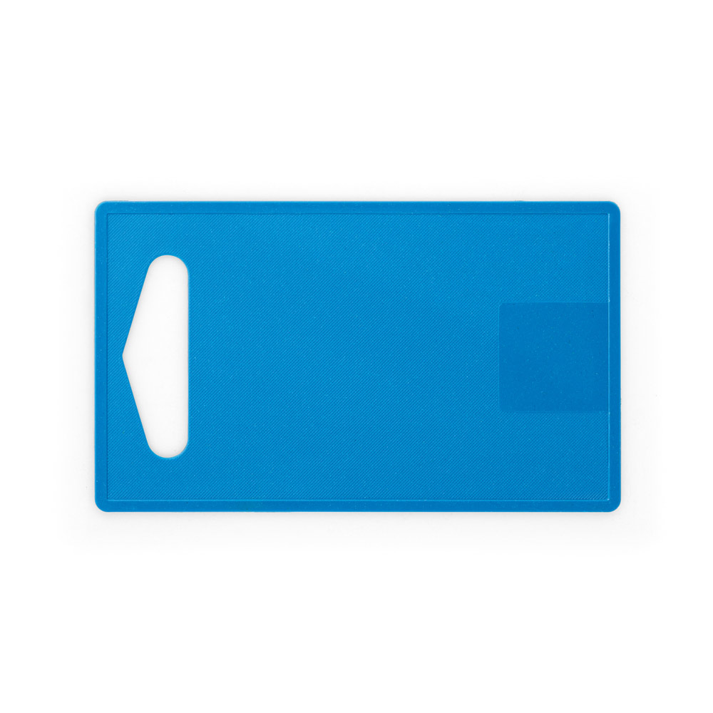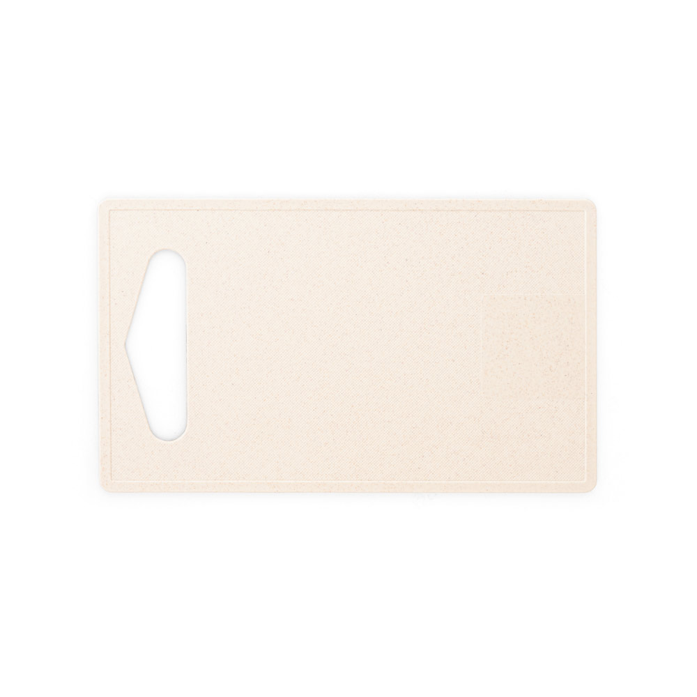 Tábua de corte em fibra de bambu (50%) e PP (50%). Contém um quadrado liso no fundo da tábua, adequado para a personalização. Certificação EU Food Grade