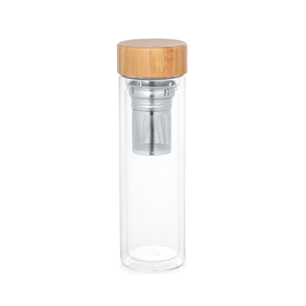 MAKAROVA. Garrafa em vidro borossilicato de parede dupla térmica, isolada a ar, com tampa em bambu e 2 infusores 490 mL