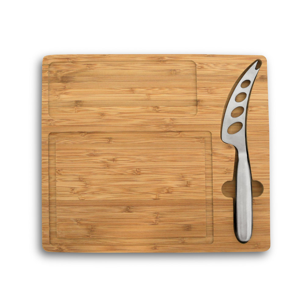 Tábua de queijos em bambu com faca inclusa. Fornecido em caixa presente de papel kraft reciclado. Certificação EU Food Grade. A cor e o resultado da impressão nos materiais naturais pode variar entre produtos. 300 x 260 x 15 mm | Caixa: 307 x 267 x 21 mm