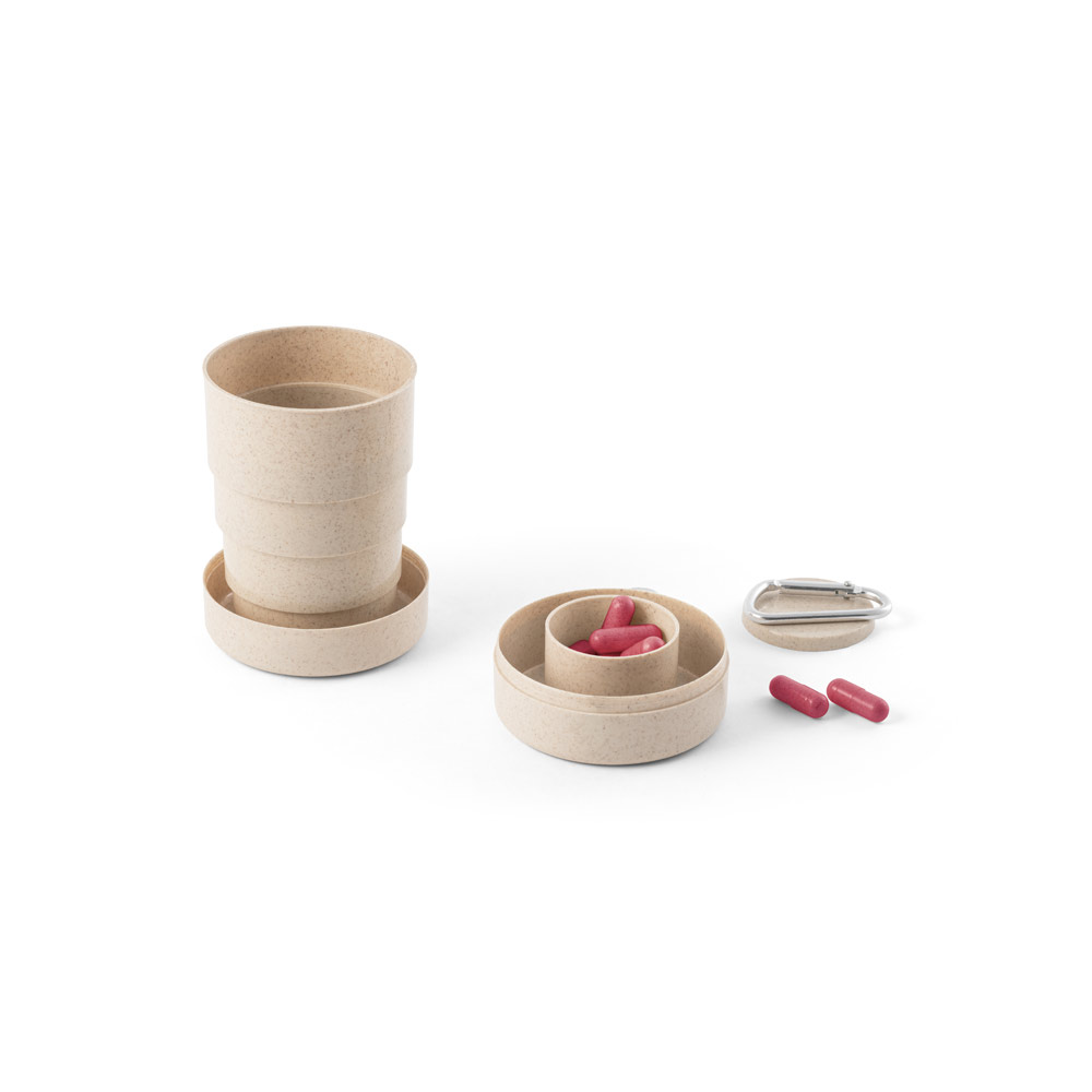 Copo de viagem retrátil em fibra de bambu (60%) e PP (40%) com capacidade até 210 mL. Incluso caixa para comprimidos e mosquetão. Certificação EU Food Grade