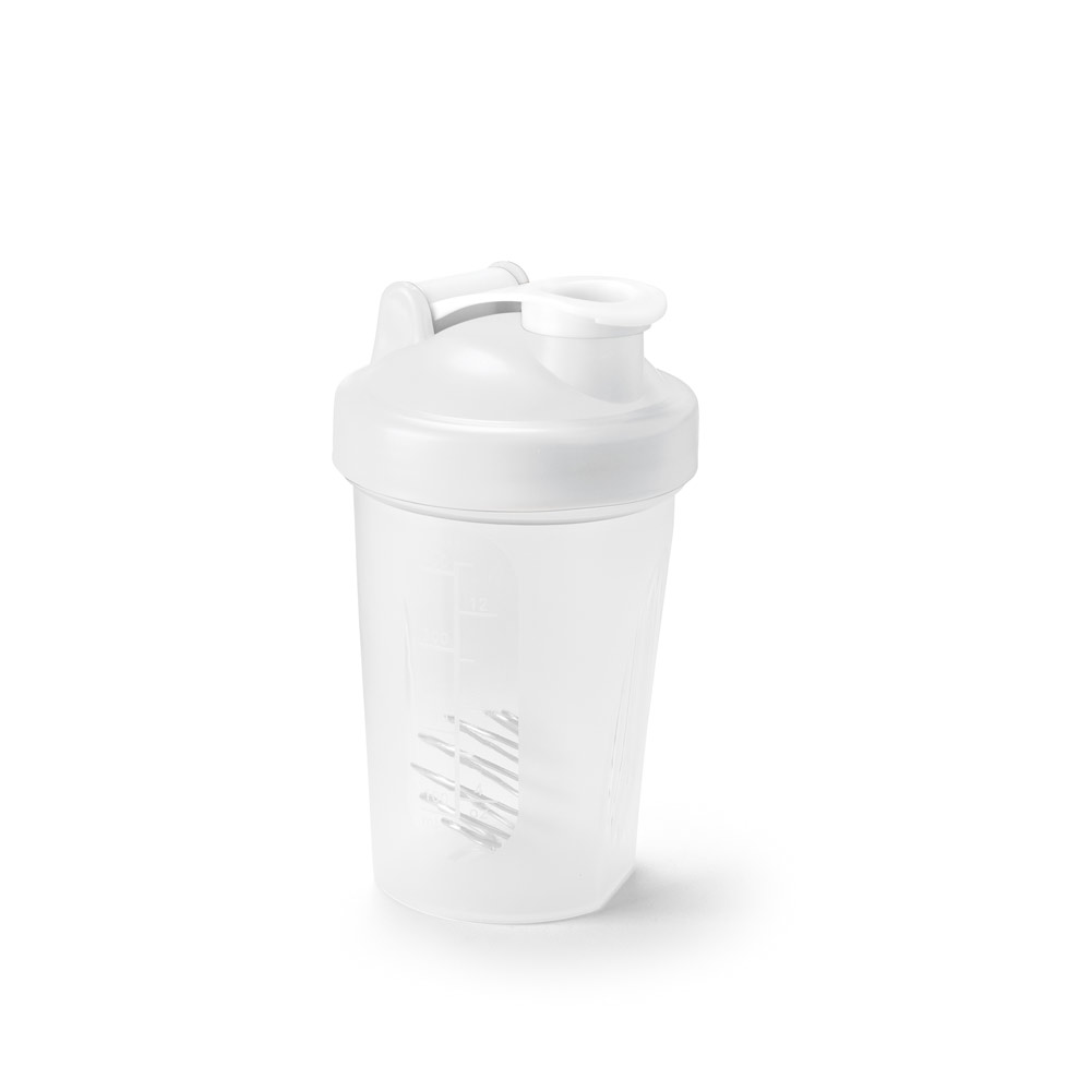 Shaker em HDPE com tampa flip top em PP. Incluso misturadora em aço inox e escala de medição até 400 mL. Capacidade até 550 mL. Caixa branca 94654 vendida opcionalmente. Certificação EU Food Grade