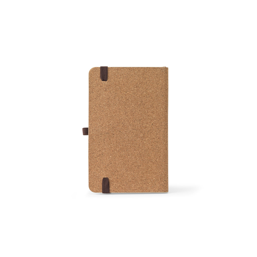 Caderno de bolso de capa dura em folha de bambu e cortiça. Contém 160 páginas, em papel 100% reciclado, pautadas cor de marfim, fita separadora, suporte para esferográfica (não inclusa) e elástico para fecho do caderno