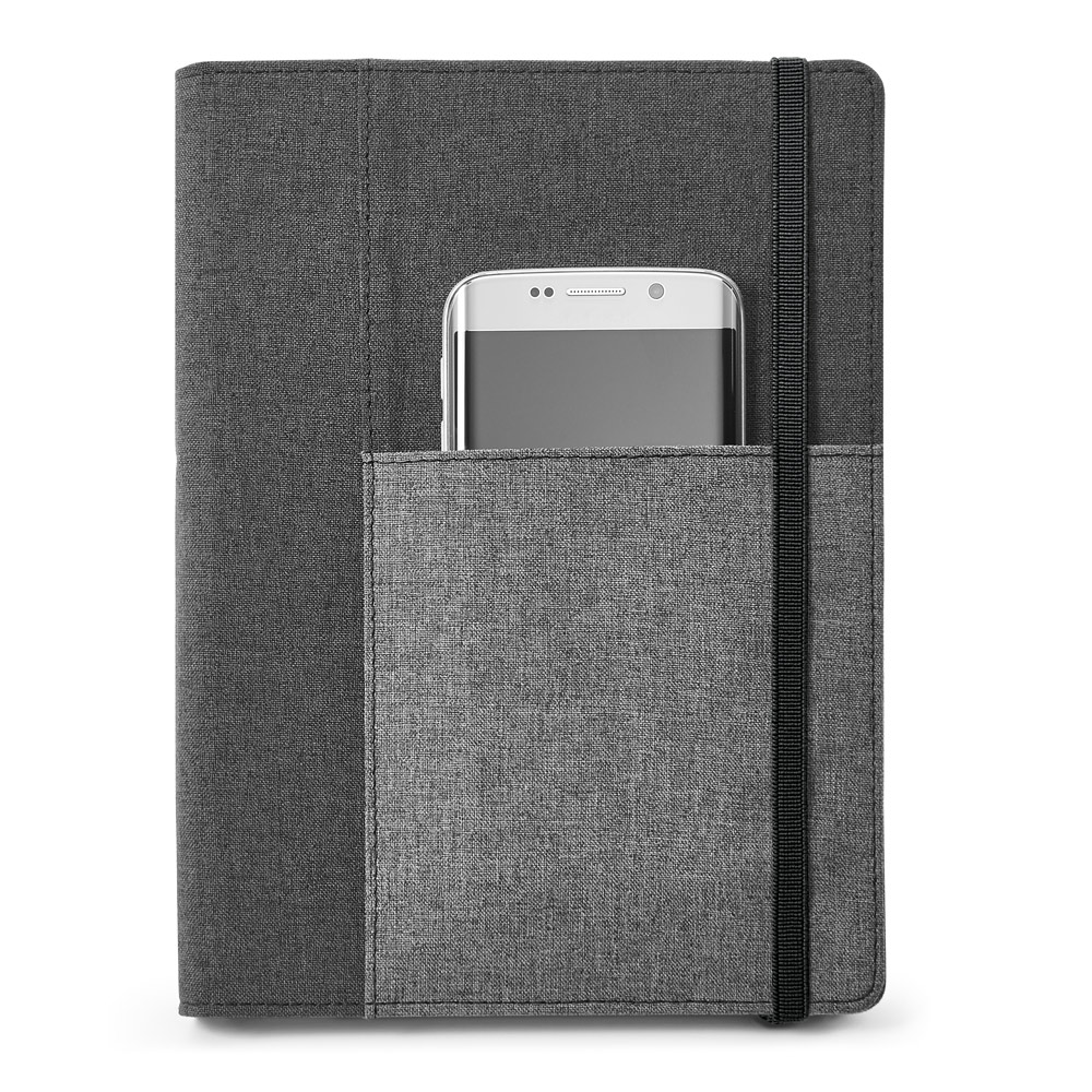 Capa de tecido em poliéster, com caderno A5 removível com 160 páginas lisas. O interior contém um bolso interior e suporte para esferográfica (não inclusa). Fornecida em embalagem de non-woven
