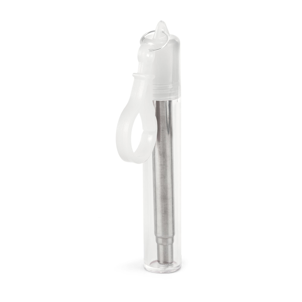 Conjunto de canudo em aço inox e escova de limpeza. Fornecido em estojo com mosquetão. Certificação EU Food Grade