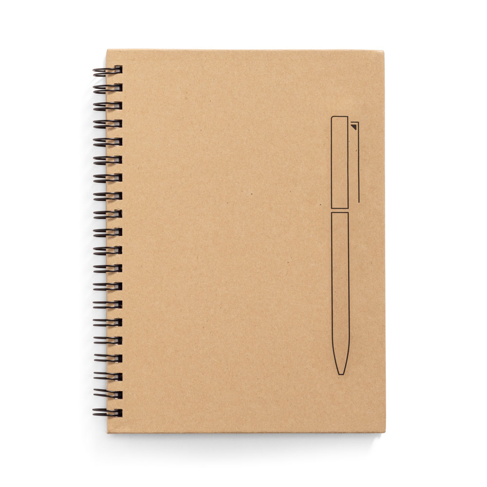 Caderno B6 espiral com capa dura em papel kraft. Contém 140 páginas lisas em papel pedra (120 g/m²) e imã na capa que funciona como um suporte de esferográfica (não inclusa)
