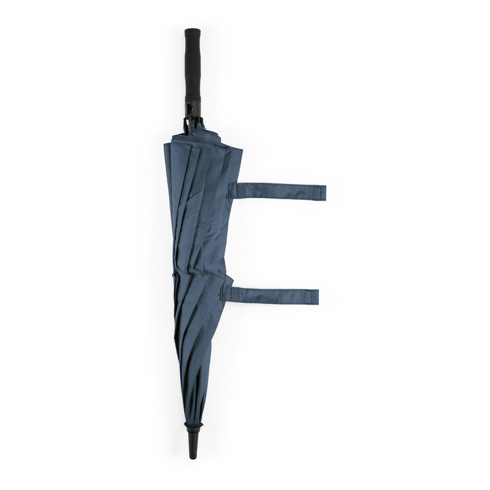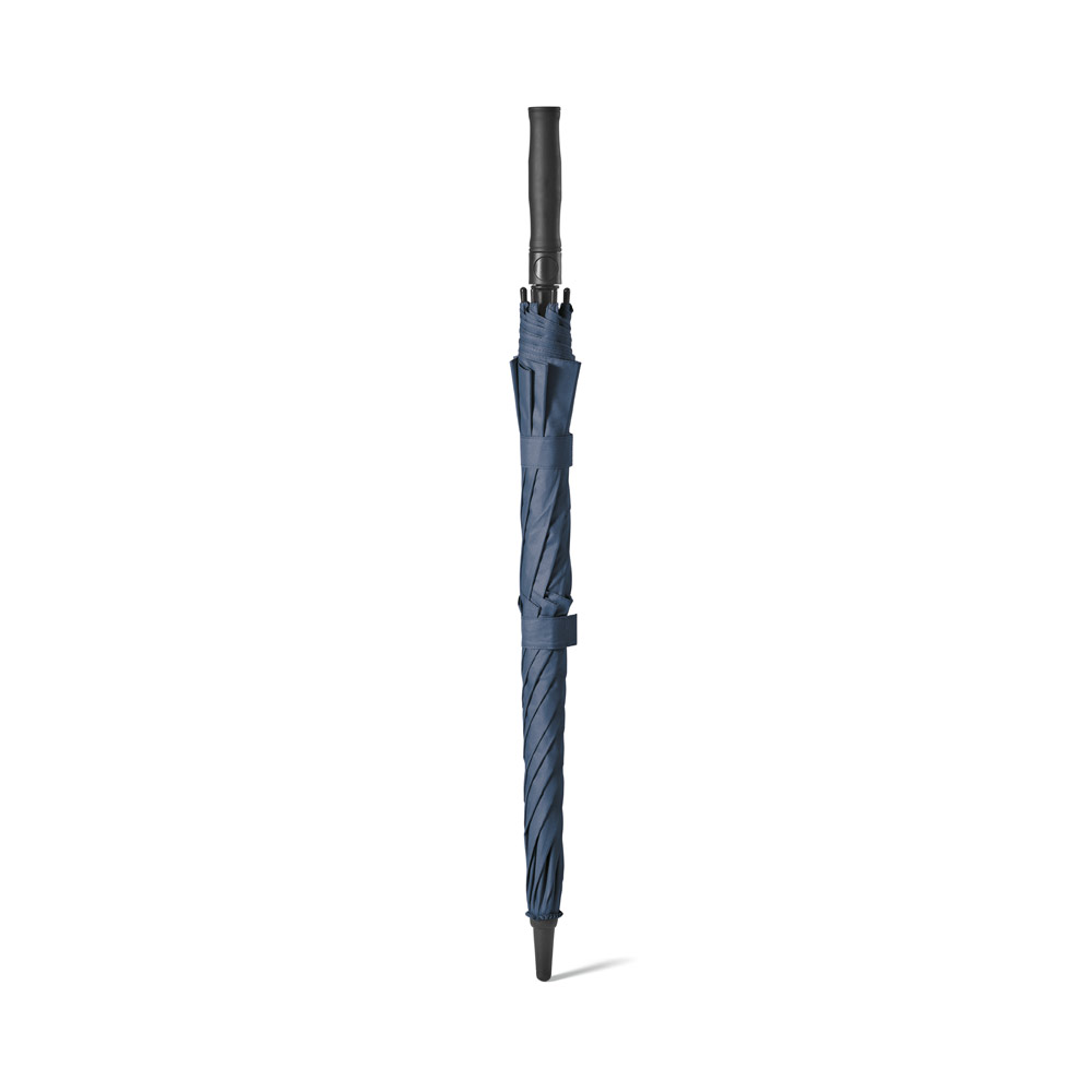 Guarda-chuva em poliéster 100% reciclado 190T, com varetas em fibra de vidro e pega em ABS reciclado. Guarda-chuva com abertura automática e à prova de vento. Fornecido em bolsa de poliéster reciclado. ø1055 x 840 mm