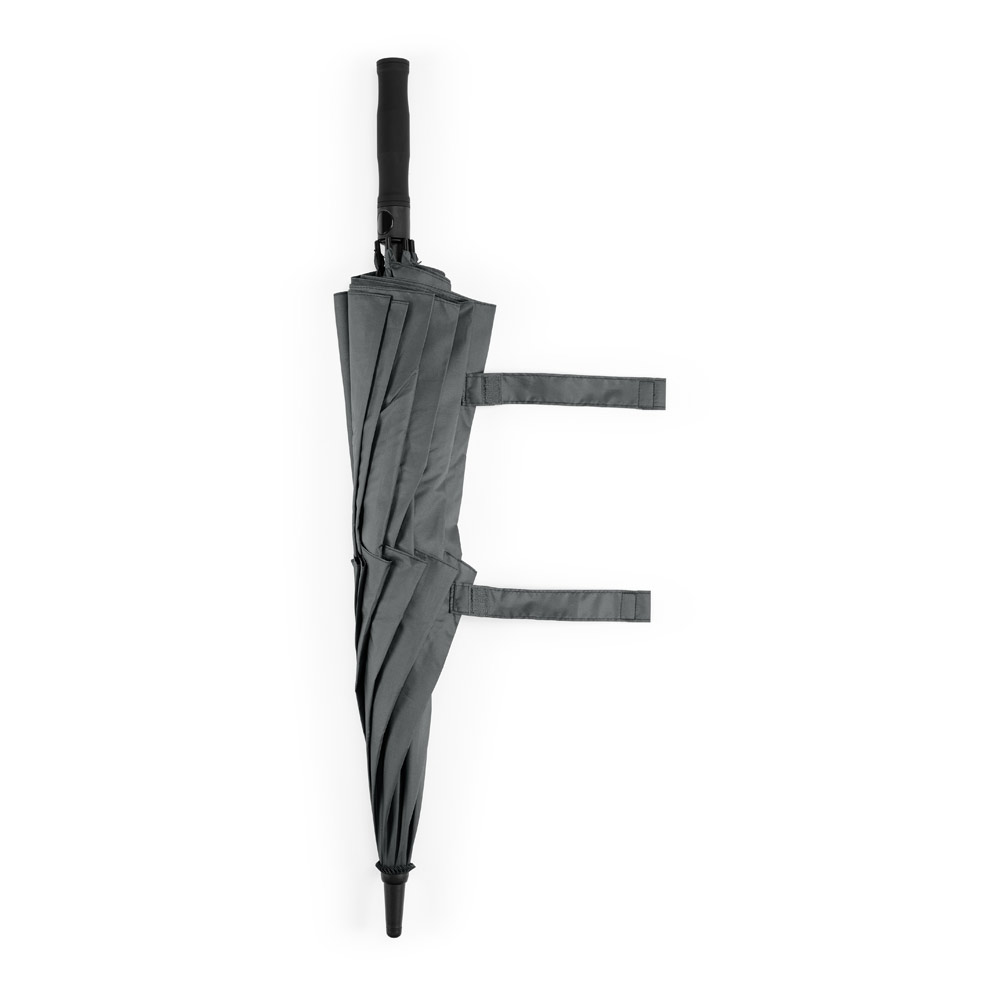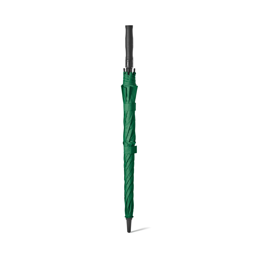 Guarda-chuva em poliéster 100% reciclado 190T, com varetas em fibra de vidro e pega em ABS reciclado. Guarda-chuva com abertura automática e à prova de vento. Fornecido em bolsa de poliéster reciclado