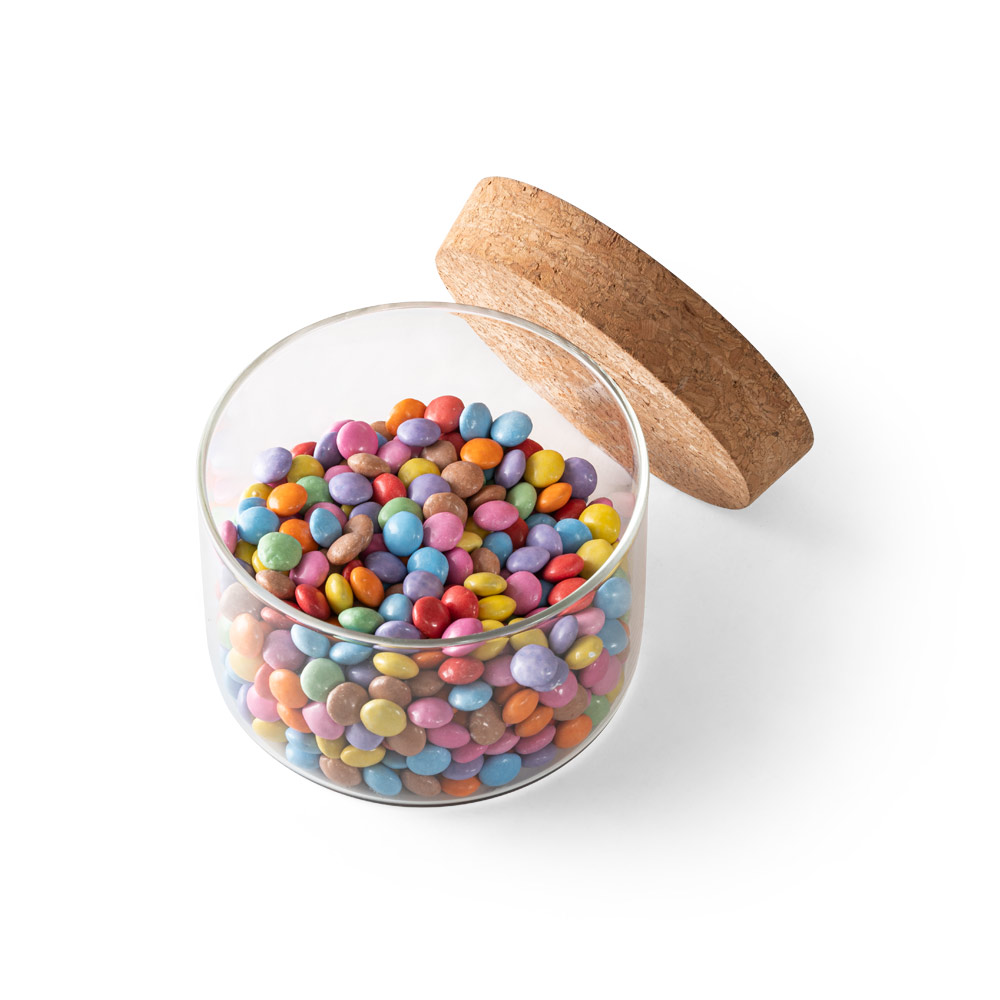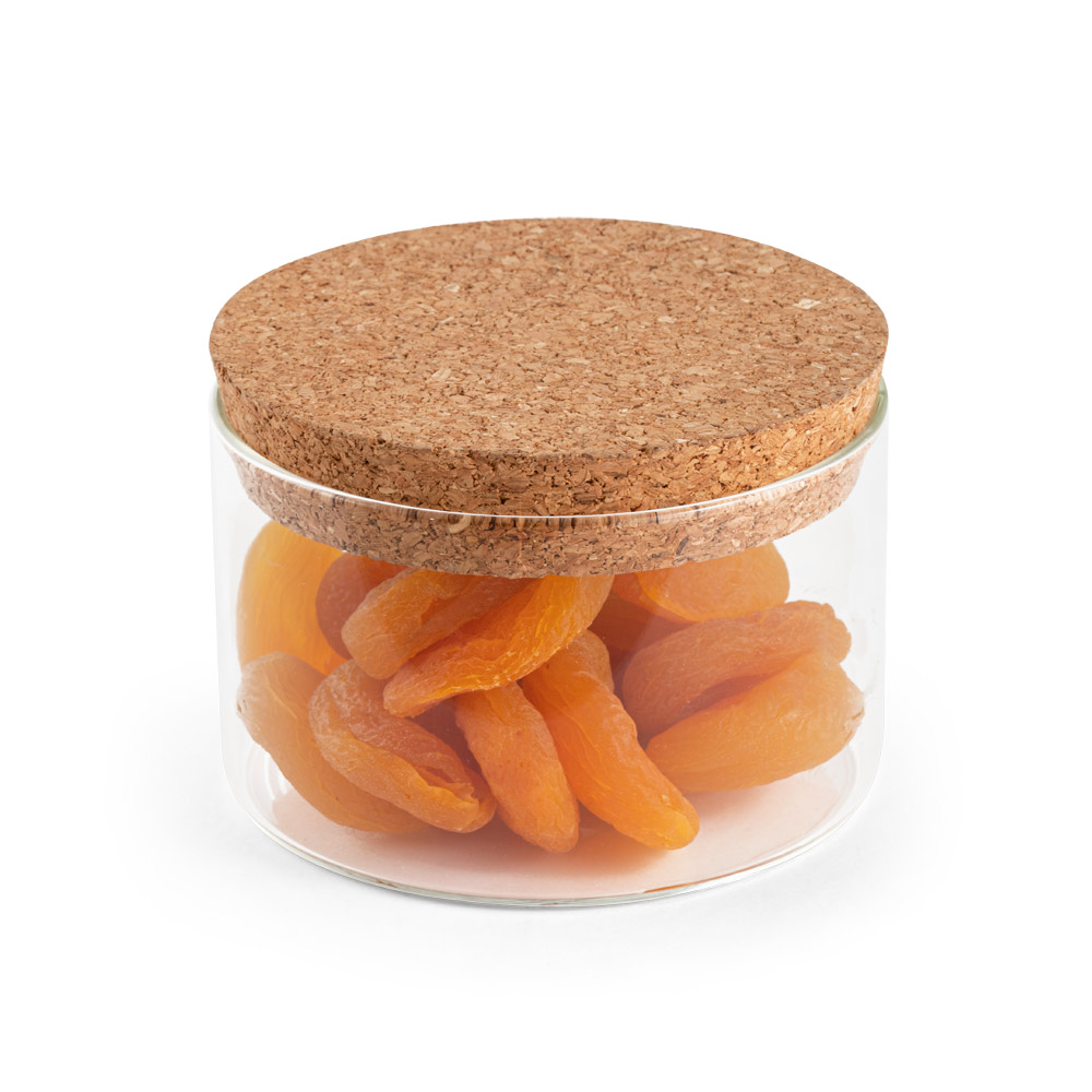 Frasco em vidro borossilicato com tampa de cortiça. Capacidade até 380ml. Fornecido em caixa presente de papel kraft reciclado. Certificação EU Food Grade. ø95 x 60 mm