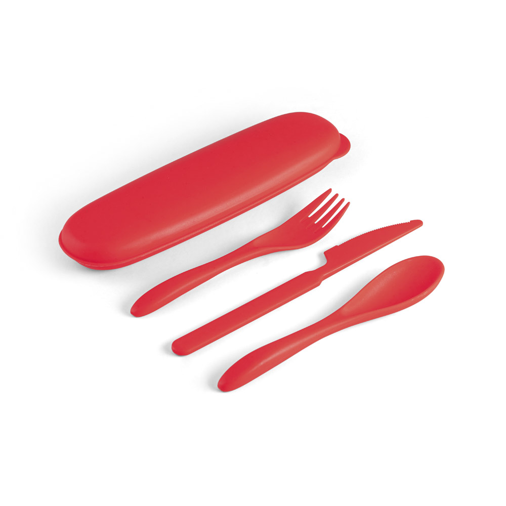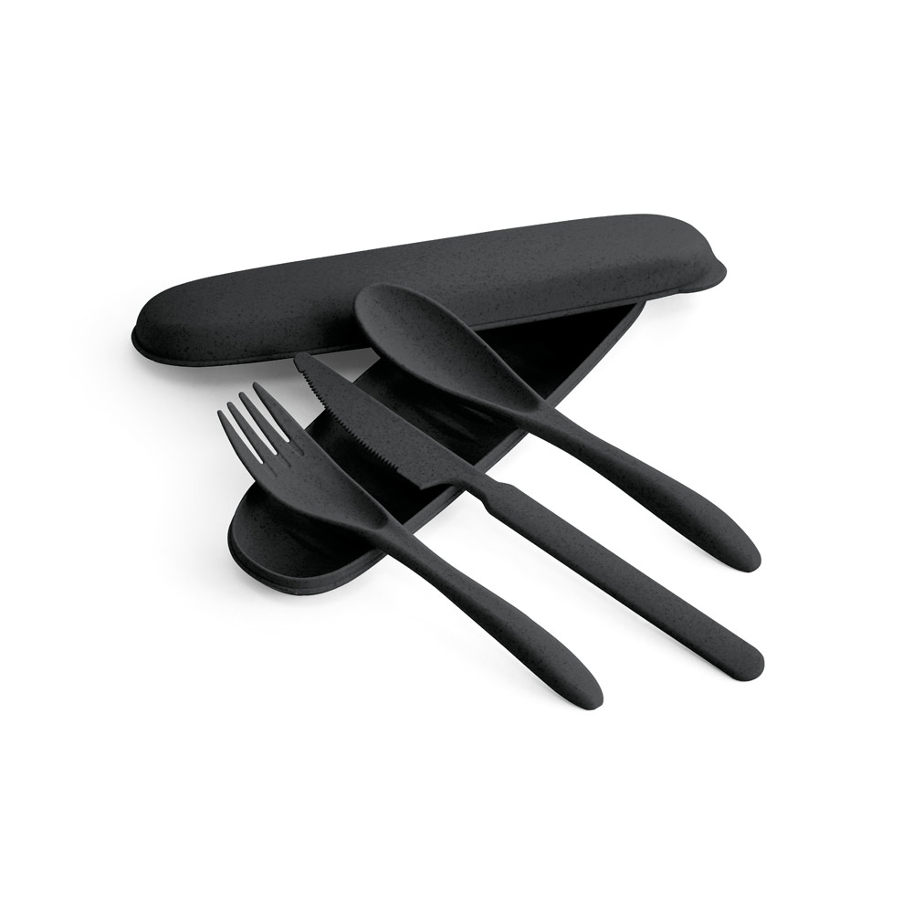 Conjunto de 3 talheres em fibra de bambu (60%) e PP (40%) com garfo, faca e colher. Incluso estojo. Certificação EU Food Grade