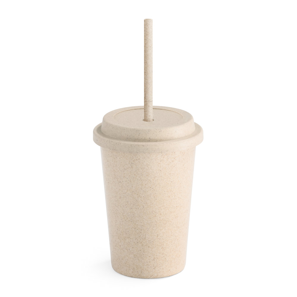 Copo de viagem em fibra de bambu (60%) e PP (40%) com tampa e canudo retráctil. Capacidade até 450 mL. Pode ocorrer transferência de calor. Certificação EU Food Grade